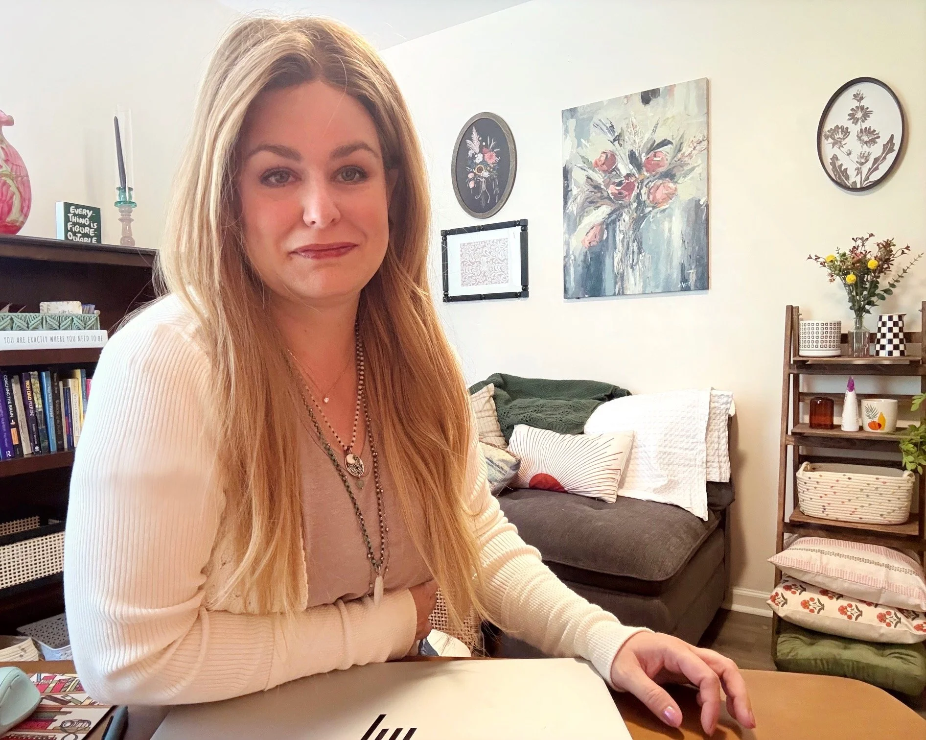 A woman with long blonde hair sitting at a desk in a cozy living space, smiling softly, with bookshelves, wall art, and a sofa with pillows in the background.